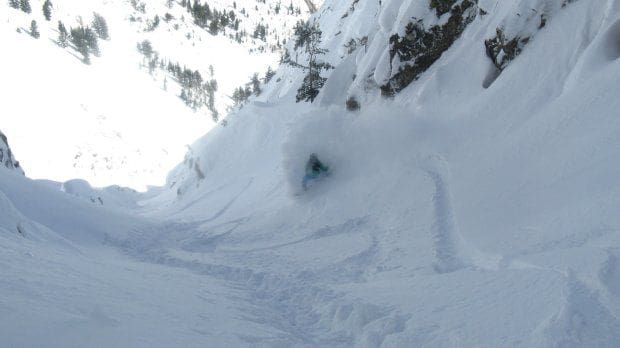 After I pointed it through the last section of Pinballย Alley I cut over to the boys who were getting ready to do a short boot up to whatโs known as the Suicide Chute. The name struck me as funny since Pinball Alley was way tighter and way steeper, but the Suicide Chute was about as fun as it gets. Forest just killed it. He surfed the walls like a perfect point break wave thatโs lined up for days, while Ryland kicked up ridiculous clouds of pow on every turn he made. They actually both disappeared in the chute for multiple seconds because the clouds they were kicking up were at least double-overhead and stayed suspended in the chute while they kept riding. It was an amazing thing to watch these two shredders float their way down this powder drenched chute, and I had just as much fun when it was my turn.