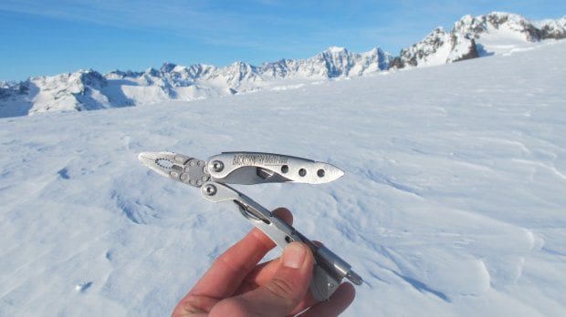Highlights include needle-nose pliers that are good enough to get into really tight spaces coupled with a wire cutter, and teeth for better gripping. The ยผโ hex-driver is also of particular interest to the skier and/or splitboarder because you can either buy specific bits you want to use from a hardware store, or just use the #1 and #2 Phillips, #3 Posi-drive bit, Torx T20 bit, or #4 Flathead thatโs included. The serrated knife is sharp and extremely functional, while the wrench can be used with 6, 8, 10, or 11 mm nuts. On the end of the tool thereโs a bottle opener and also the ability to use the tool as a #9 flathead. Wrap this all up in a durable carrying case that even has a convenient pocket at the back for carrying extra bits (including the bit extender, hex drive drill bit, and awl that comes with your purchase) and you have about as highย quality of a multi-tool that you can buy for your all your backcountry needs.