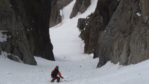 In terms of steepness the couloir is about as gentle as a big walled line comes. As the line got steeper, the new snow on top of a firm base made for easy slips and tough edging. We probably couldโve skinned longer than we did, but booting made sense as the new snow from earlier in the week was just too slippery to skin through. ย