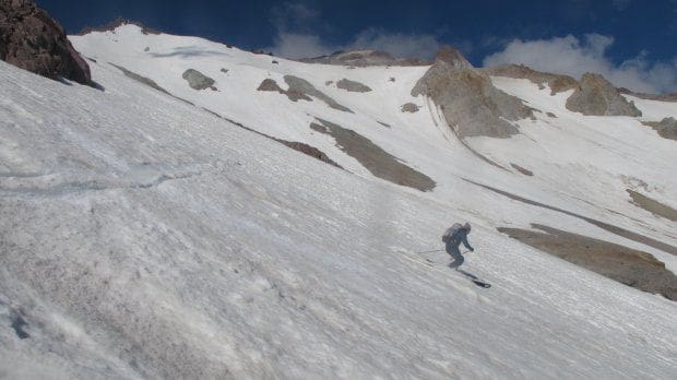 The whole 4k+ foot descent doesn’t go right now, but the few minutes of walking out, with the dramatic scenery, and quality skiing for so late in the summer is more than worth the effort. The sun cups are definitely showing, but there’s still a great deal ofย smooth snow to shred up there. Even better, most of the enticing terrain in Lassen Park ย has tons of ski tracks right now. People have for surely been earning their turns up there, on Mt. Diller, Lassen Peak, and on the plethora of surrounding terrain that’s skiable.