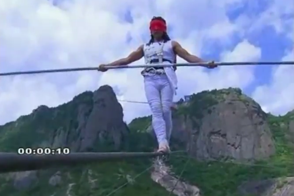 How did this guy live?ย Chinese Dawa Zi acrobat Aisikaier suffered minor injuries after falling from a high-wire suspended over 200 metres (656 feet) off the ground. Aisikaierย attempted to walk backwards and blindfolded across a ravine in central China on Sunday (July 8). Luckily he was just 40 metres (131 feet) from the end of the 700-metre (2,297 feet) high-wireย which made his fall far smaller then the 200 meters he had previously walked over. ย ย