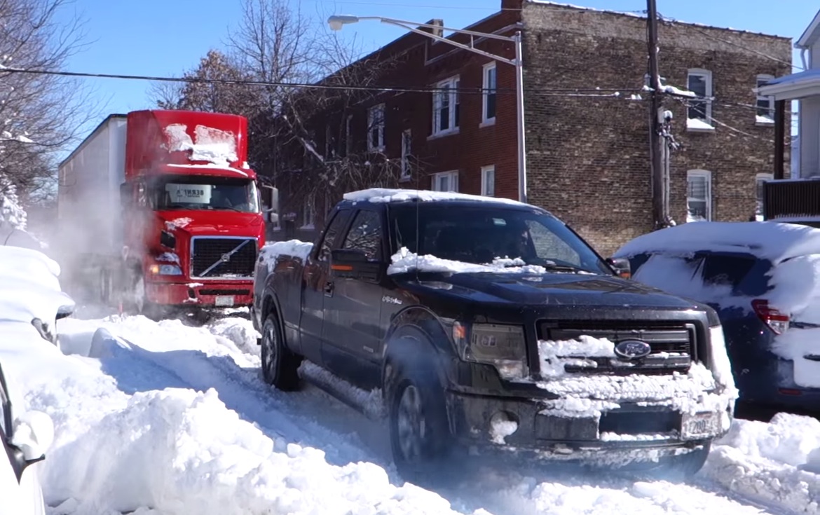 Ford F-150 FX4Â to the rescue. Â This 18-wheeler was stuck on an unplowed Chicago side street for a few hours before this Ford came and towed him out. Impressive.