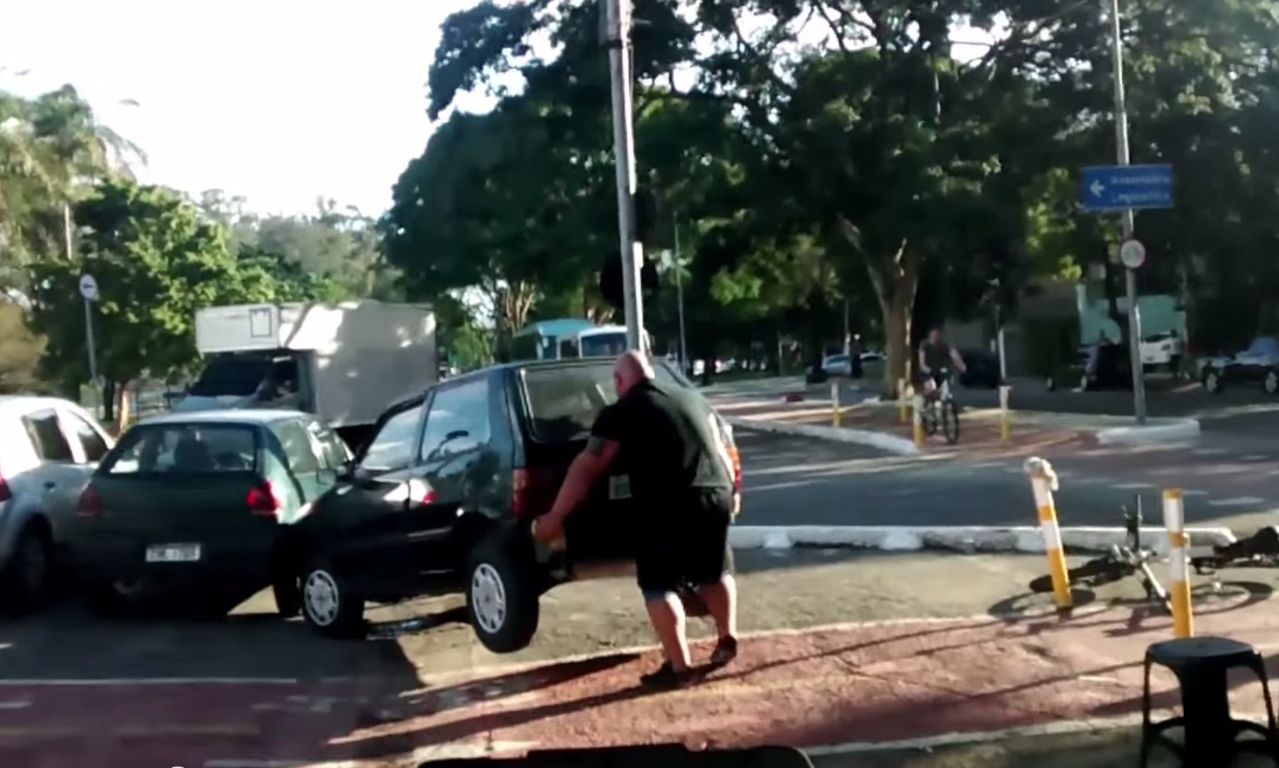 A cyclist pedaling along a bike lane came across a car blocking the bike lane. So the cyclist did what any strongman cyclist would do. He got off his bike and did something about it.