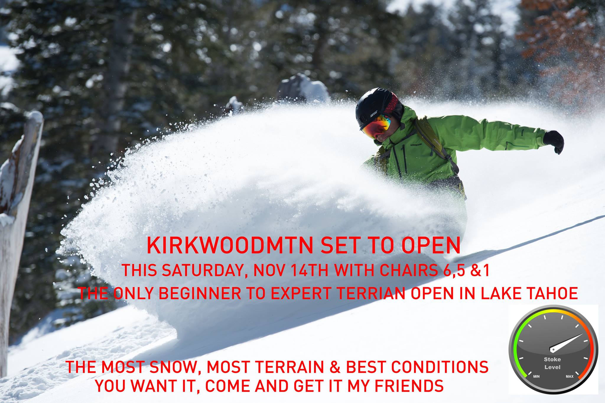 It’s official, Kirkwood Mountain Resort is opening this Saturday, November 14 after 26” fell on the resort in the past 3 days. The announcement was made via the resort’s Facebook page, which has become rather fun to read thanks to the stylings of Coop. According to the announcement below, Chairs 1,5, and 6 will be running with the only expert top to bottom terrain in the greater Tahoe area.