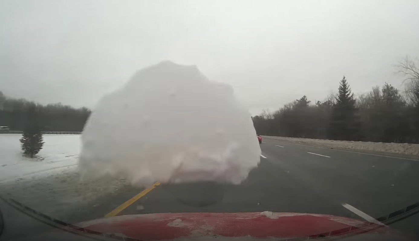 This video, filmed yesterday on I-49 in New Jersey, shows exactly what can happen when a careless driver doesn’t bother to clean off their roof. The dash-cam footage shows a hefty chunk of flat ice flipping off the roof of an SUV and spinning through the air before colliding with the windshield of the Saab following it.