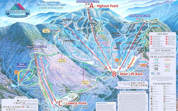 Example 2: The solitary trail that inflates the vertical drop, but adds little to your ski experience (Smuggler’s Notch)