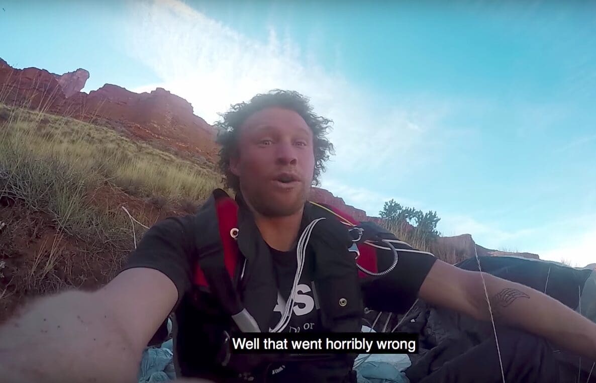 Sketchy Andy Lewis living up to his name on this terrifying B.A.S.E. jump cutaway gone sideways. In an incredible stroke of luck, he landed in very soft sand and only got the wind knocked out of him. He seemed 100% okay but I’m sure he will be replaying this one in his head for a long time to come.
