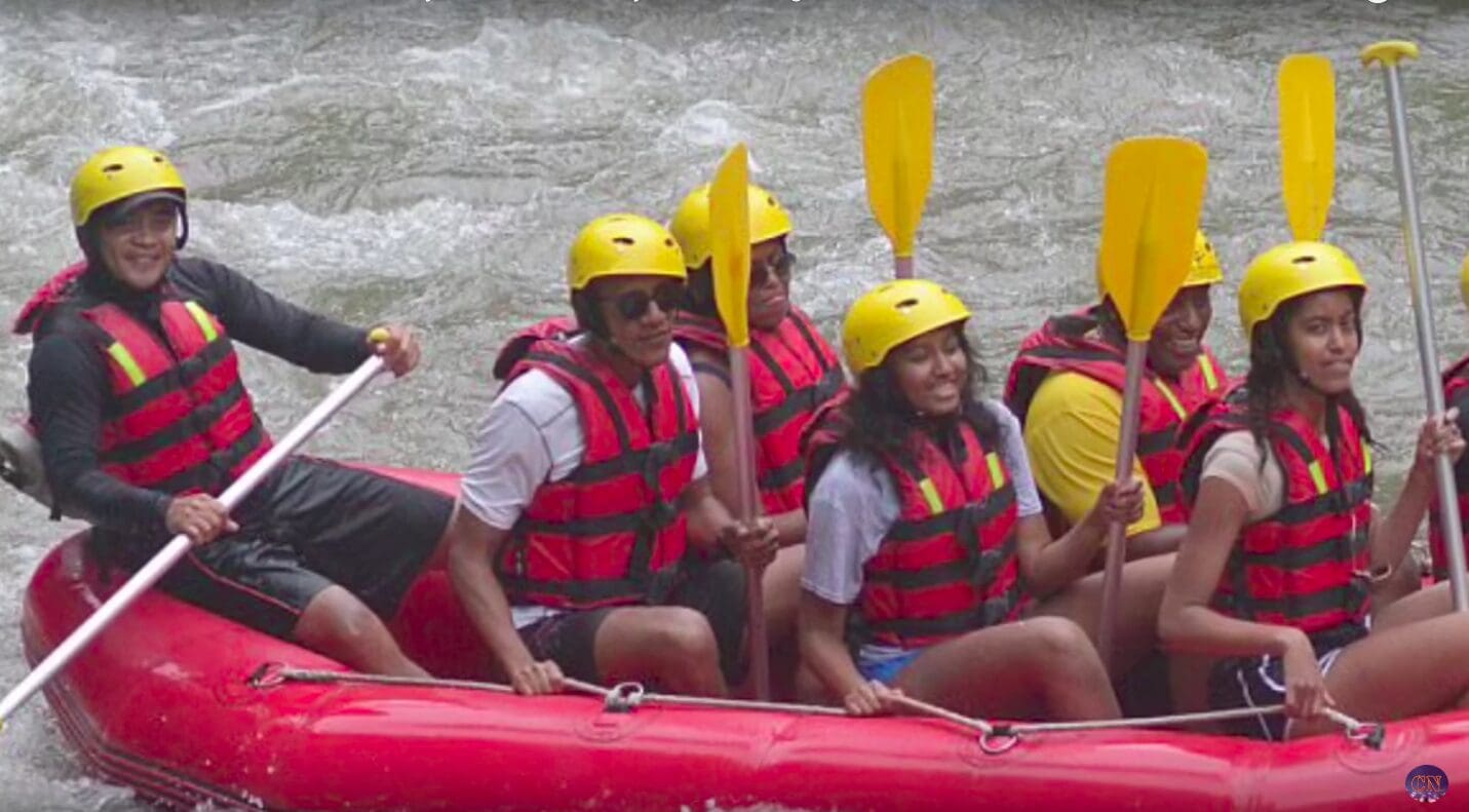 Got to love the raft by high-five with the Ex-Prez while on a family trip in Bali. The Obamas were on the Ayung River in Bali on Monday during their nine-day vacation to Indonesia. I always wonder what the protocol for the Secret Service is during stuff like this….anyone have any idea?