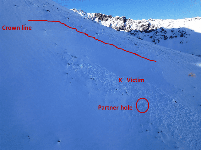 The pair left the trailhead (7,250’) at 0600 on Saturday for a 6 mile approach to the peak. Hiking on a dirt trail, carrying their equipment, they likely transitioned to ski gear at snowline around 9,200’. Near 10,000’ at the bottom of the couloir, they were ascending on skis with skins when they triggered the avalanche. Both were caught, Skier 1 was buried to his mid-chest and back of neck, and Skier 2 was fully buried. Skier 1 had an avalanche beacon, shovel and probe. Skier 2 had a shovel, probe, and an avalanche beacon that was turned off in her backpack. We have no knowledge about Skier 1’s beacon prior to the search. Skier 1 dug himself out of the debris. He turned his beacon to “search” and scanned the debris for Skier 2, but did not get a signal. They had not done a previous beacon check. He attempted to locate her by probing and shoveling through the debris. After three hours of searching, Skier 1 was unable to find Skier 2 and walked out alone.