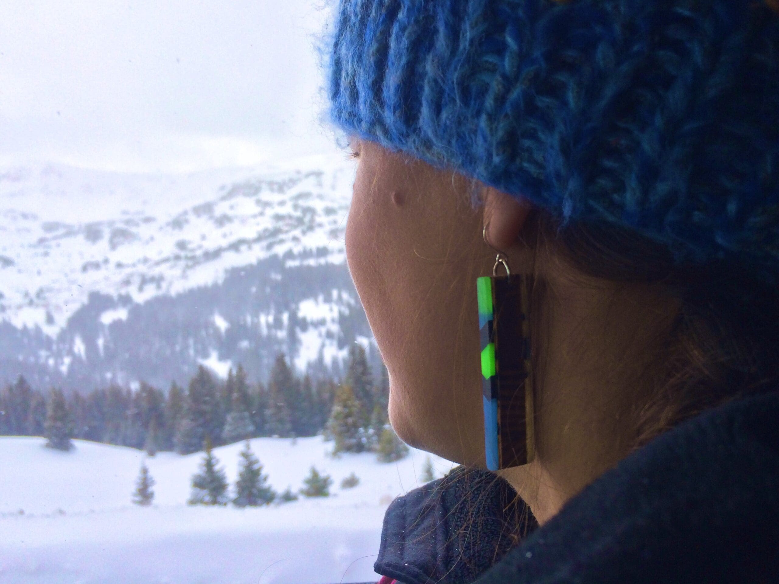 Our best seller! Beautiful yet simple, these sleek earrings add a splash of brightness to your outfit while reminding you of floating through your favorite powder run. Earrings are 2″ long x 1/8″-1/2″. Nickel free plated silver or Antique Brass ear wires.