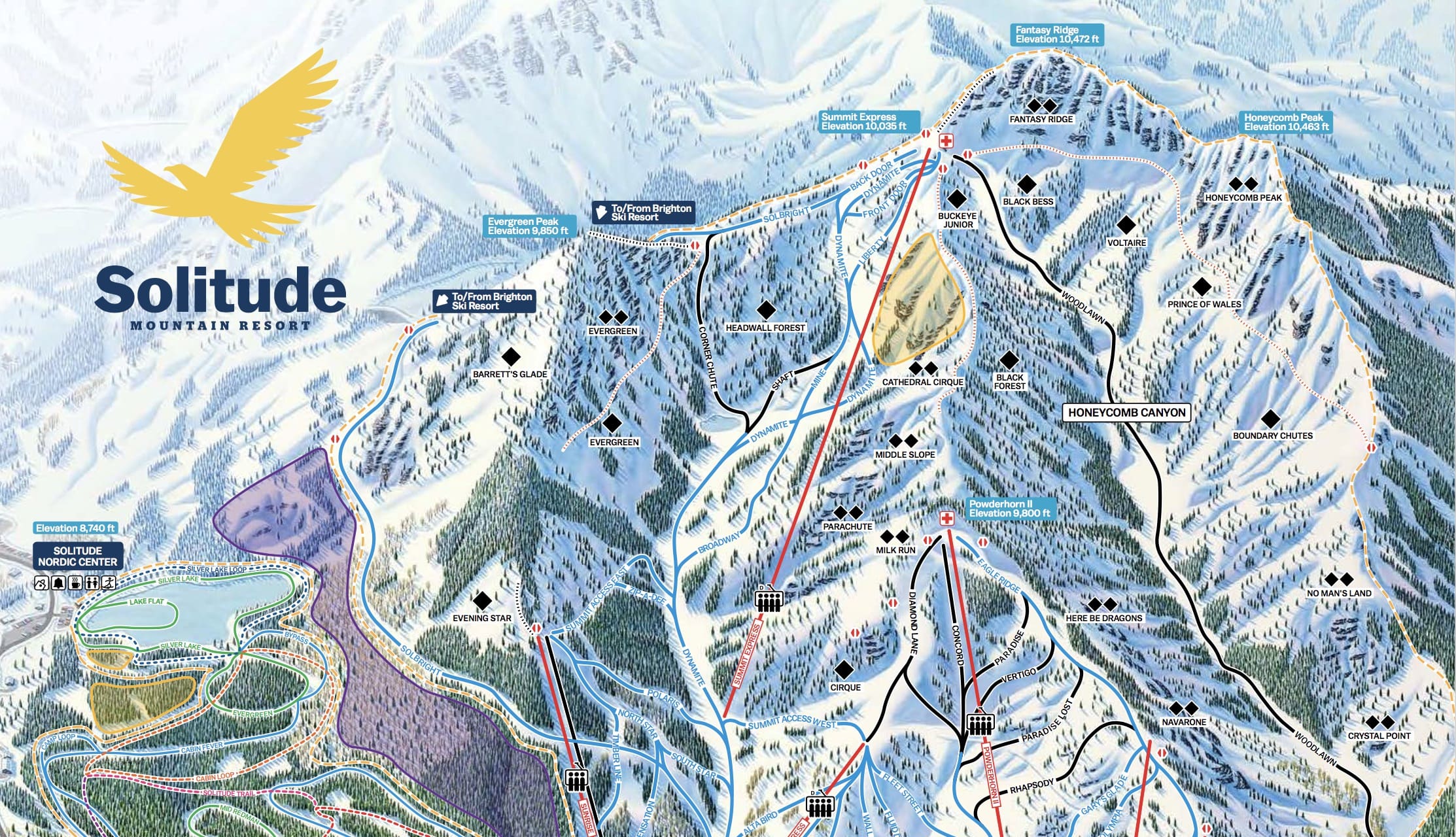 Solitude Mountain Resort is located just 34 miles from the Salt Lake City International Airport (SLC) and less than an hour from Deer Valley Resort, in the renowned Big Cottonwood Canyon. The mountain offers skiers and riders 77 runs, three bowls, and a vertical drop of 2,030 feet (619 meters) across 1,200 acres, plus some of the most impressive off-piste terrain in the country. The quaint base village offers ski-in/ski-out accommodations along with year-round activities for guests.