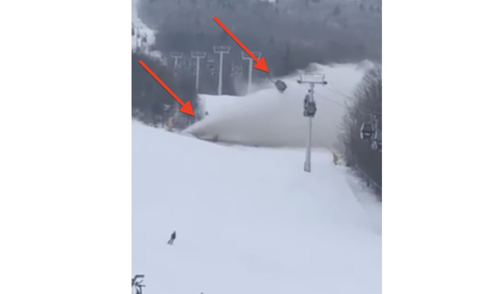 “We are thankful to report that no one was injured in what was a scary episode for seven skiers and riders in two gondola cabins. At about 3:30 pm Christmas Eve, a break in a snowmaking pipe on Lower Standard sent water at a 45 degree angle toward the gondola. Snowmaking computers showed a drop in pressure and operators immediately began the process of shutting down the system. The operations team simultaneously stopped the lift, restarting it slowly to reposition the cabins. Approximately seven minutes later, the gondola made its way to the summit where guests disembarked. The gondola is running as usual today and snowmaking operations continue using alternate pipes in the network.” – Myra Foster, Senior Manager Of Marketing And Communications @Stratton