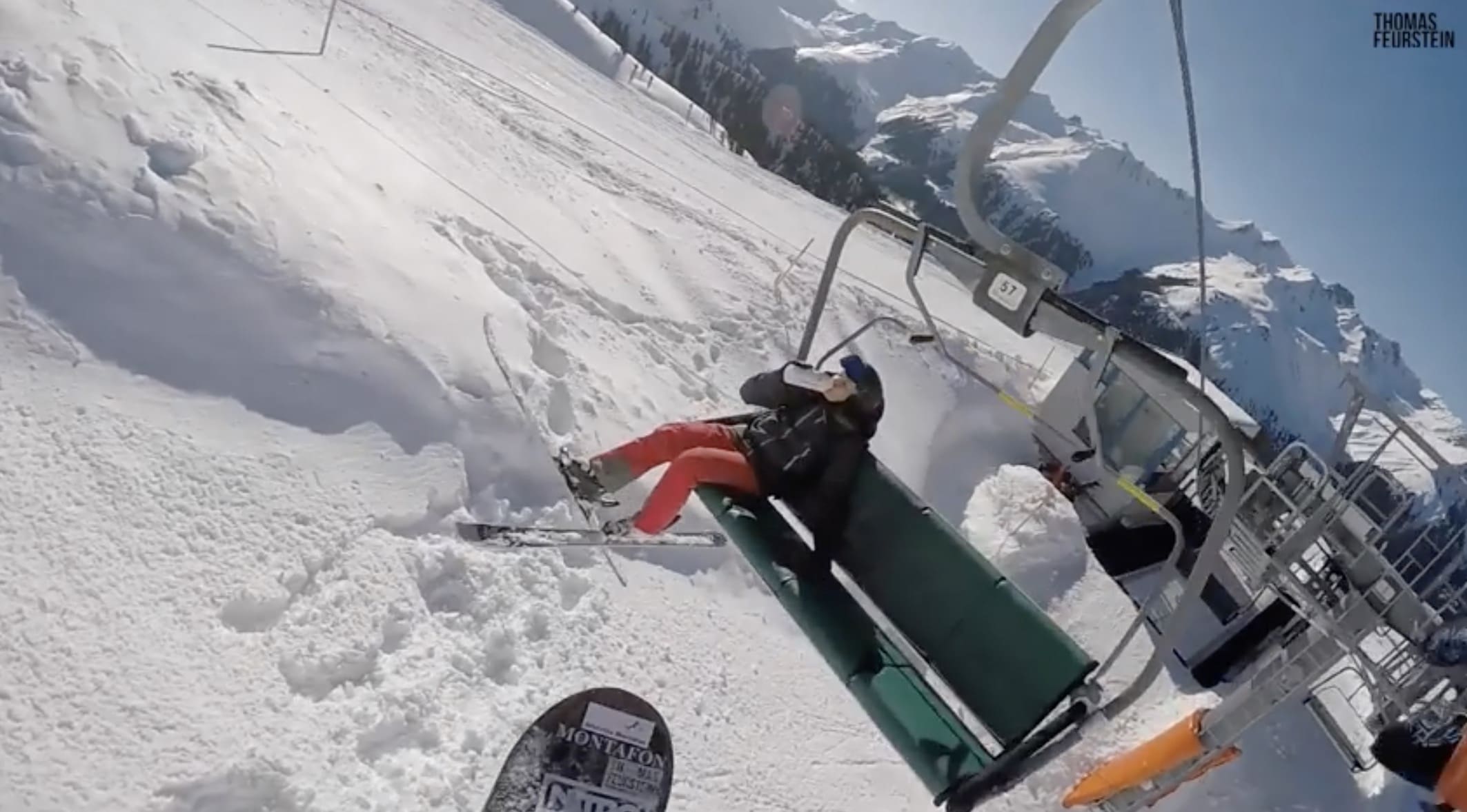 Thomas Feurstein posted the below video of himself airing onto a chairlift. Hard to tell if it was staged or not, but the skier sure got a hard bump. Kids, don’t try this at home.