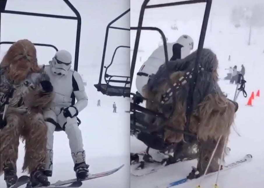 It was an incredibly tense moment when Chewbacca and Stormtrooper realized they would have to share a double chair after lining up in the singles line. Everyone in the liftline was ready for a throwdown brawl but the pair agreed to a temporary POW day truce because “Freshies don’t come every day and we could blaster each other in the parking lot after slaying.”