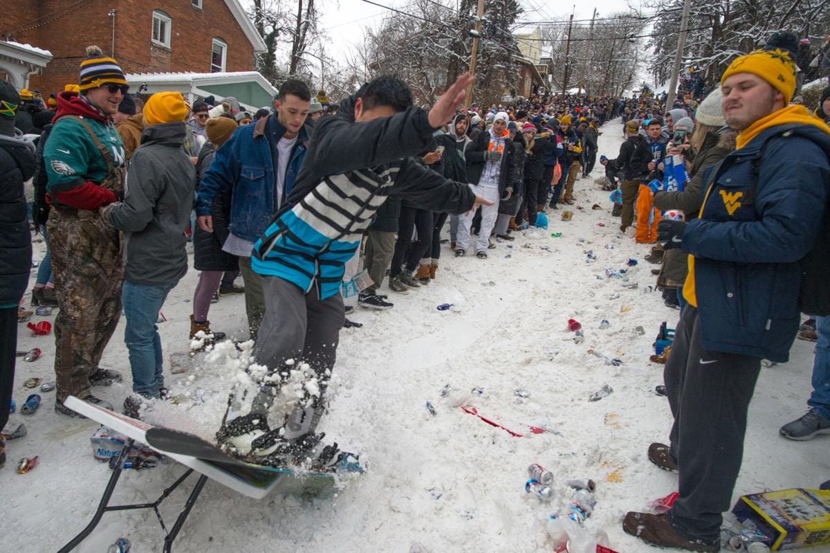 I was a student at WVU and partook in the festivities back in 2016, and I wrote about skiing down a street that runs parallel to Spruce.