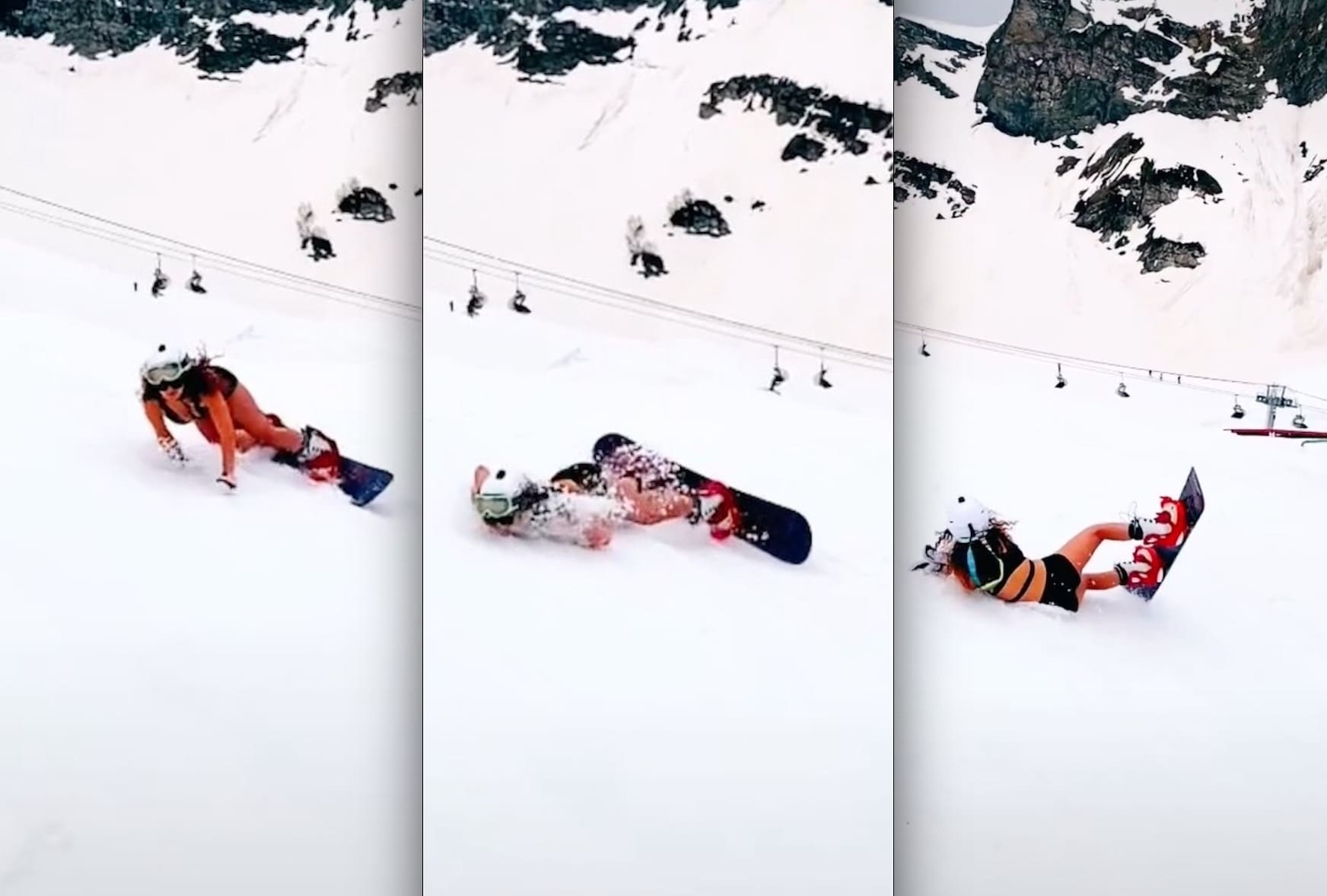 Tough day on the slopes for this Russian figure skating coach who took a face full of corn snow while bikini shredding at Mammoth Mountain. One thing about figure skaters, they grow up taking slams on ice like you wouldn’t believe and as tough as nails. Betcha she shook this off like nothing: