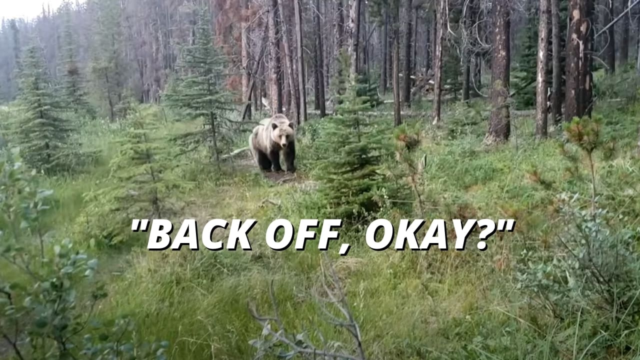 “It was about 9 pm and I was mountain biking the Hochimini trail in Jasper Alberta when I came across a grizzly bear in the slough part of the trail. She was initially barely in view, maybe 50 ft away, but I could see it was a bear. I stopped and said ‘hey bear!’ while pulling out my bear spray and grabbed my cell phone to record the encounter. The bear continued walking toward me and the video starts when I say more sternly ‘back off, okay?’ while pointing bear spray at her.”
