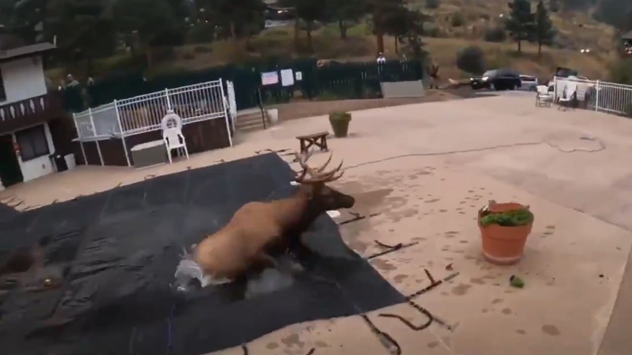 On Sunday in Estes Park, Wildlife Officer Rylands responded to a bull elk stuck in a swimming pool. With the help from Estes Park Police Officer Watson, they were able to rescue the elk and send him on his way. https://t.co/ll4mswSrm1 pic.twitter.com/3yhid91Ffa