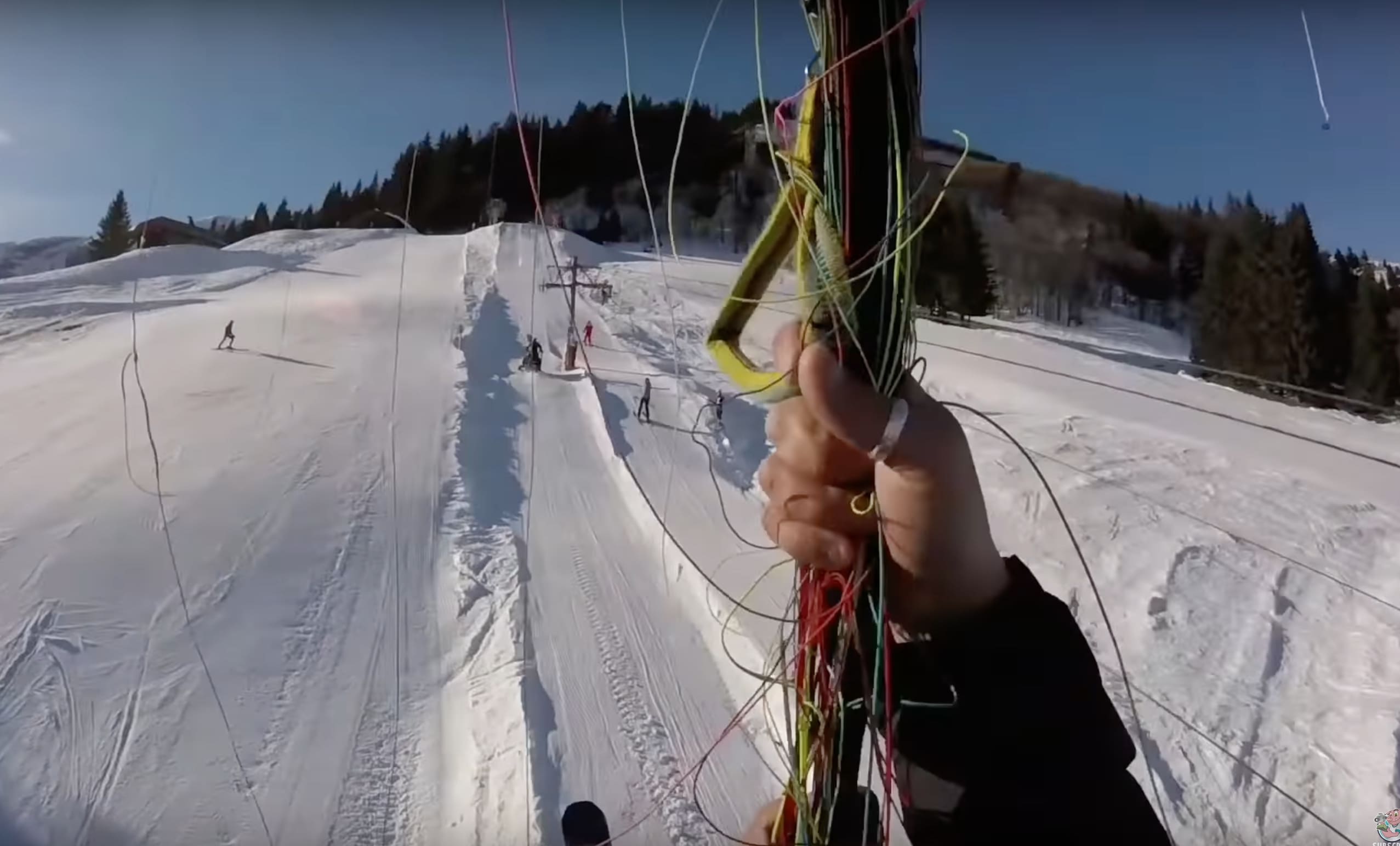 Rules at ski resort in Europe are bit loosey goosey compared to what is acceptable stateside and sometimes that tolerance for all things rad goes sideways. Such was the case at for this speedflyer in Cordon, France who was momentarily distracted filming his own shadow and collided with a lift cable shortly after takeoff, leaving dangling in the wind above the ski resort. Luckily ski patrol was on scene lickety split and lowered him safely without injury. Wild scene for sure.Â