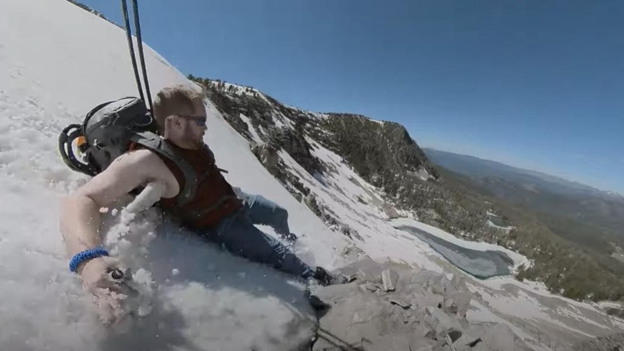 A hiker was filming himself during an outing at Big Sky, MT earlier this summer. He was attempting to glissade, the act of deliberately sliding on wet summer snow, to reach a rock band lower on the mountain.