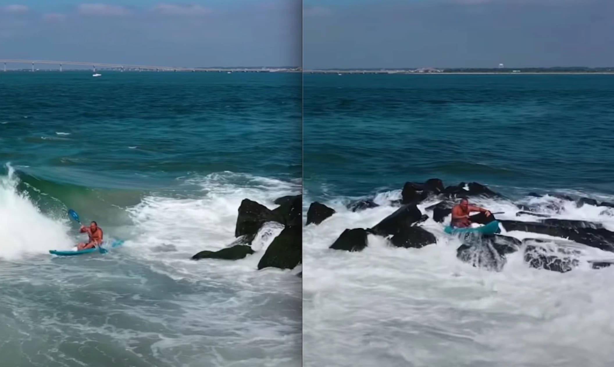 Unbelievably lucky kayaker somehow landed right side up and seemingly unhurt after getting tossed by a wave into an outcropping of jagged rocks.ย ย If I knew this dude I would slip him $20 for Powerball tix and cross my fingers. Lucky af.
