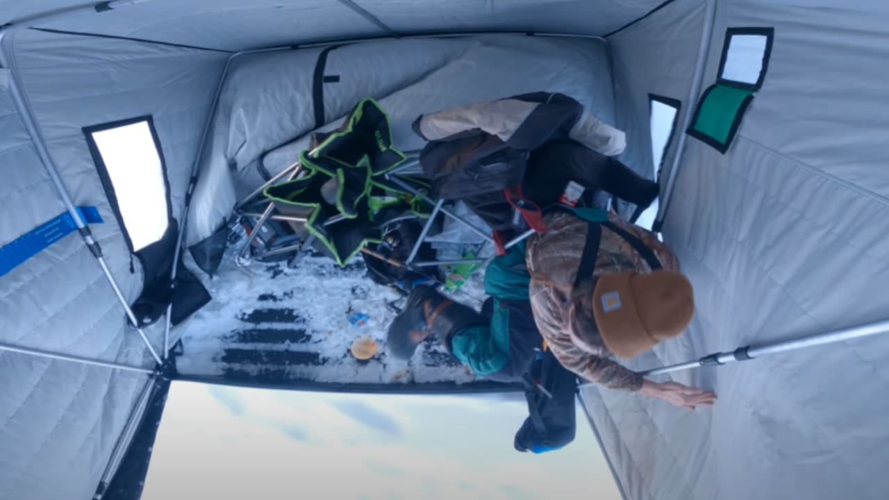 Get in There Outdoors: “I go for a ride, while fishing for lake trout in northern Minnesota, after my buddy takes off on his snowmobile……which is still attached to the fish house I am in!”