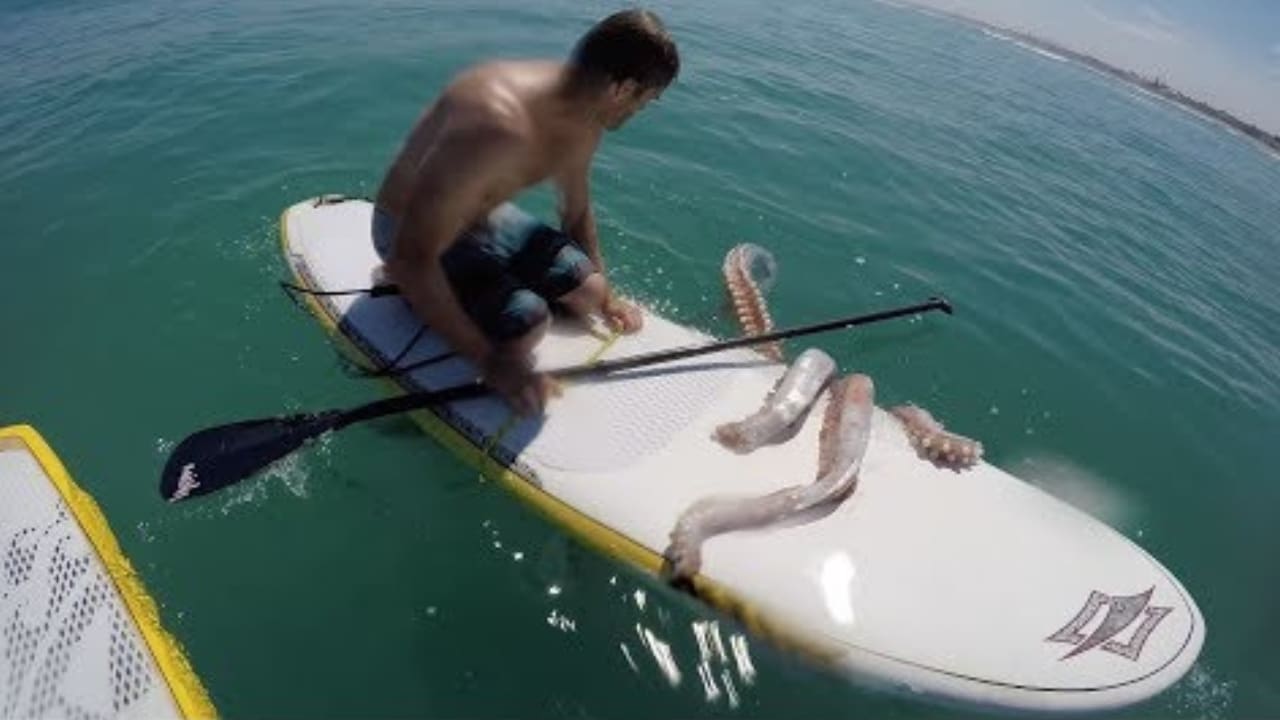 A group of paddleboarders encountered a juvenile male giant squid floating near the surface in the video below. The squid appears to be injured and has floated to the surface to die. It most likely got in some sort of scuffle deep down in the ocean below.