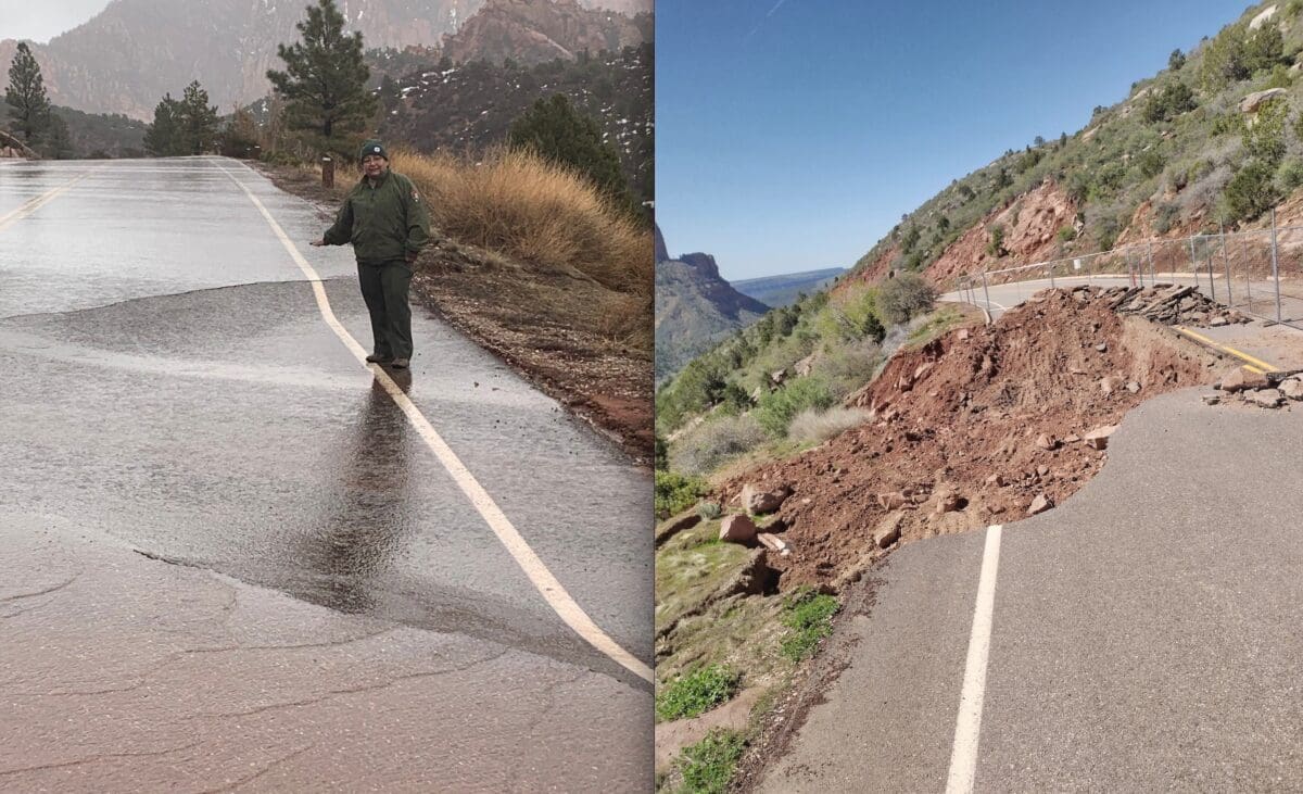 With record breaking precipitation all winter, Zion National Park experienced quite a few geologic events from small rocks just slipping down onto a roadway to the giant gaping hole that formed on the Kolob Canyons Road March 15th, 2023.
