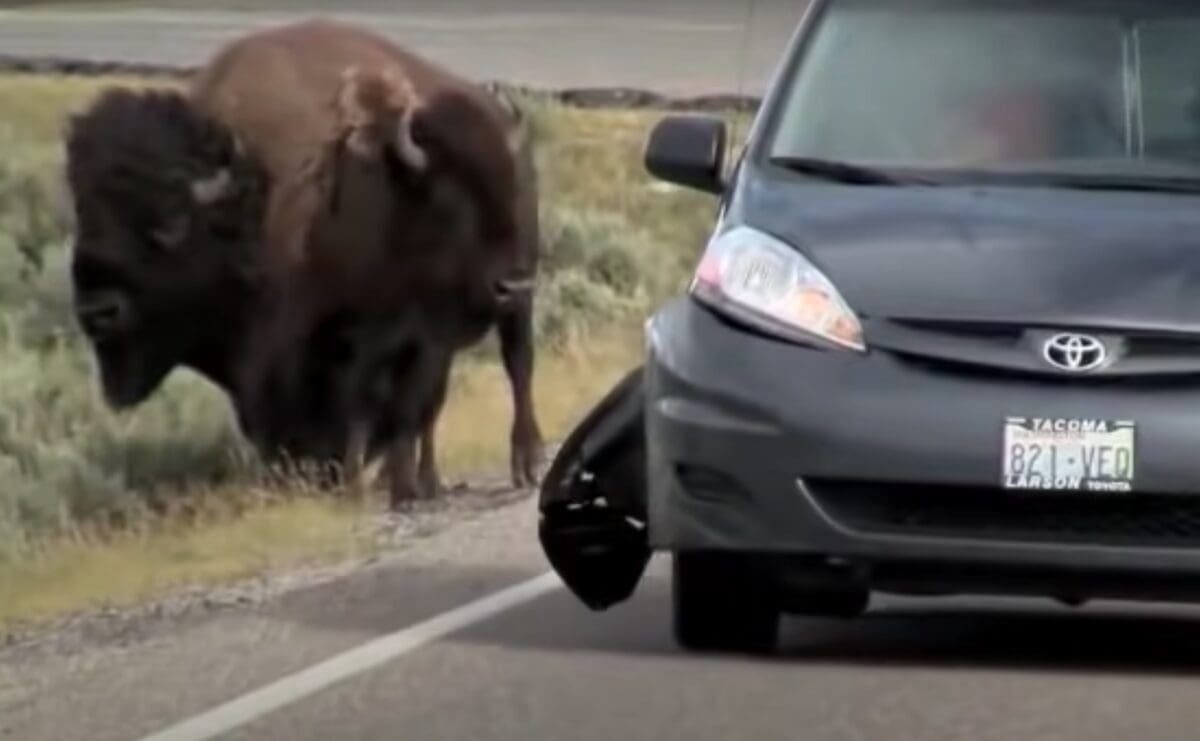 Instead of coming to a complete stop and letting this group of bison clear the road, this minivan driver decided to tempt fate and inch his way past…bad idea.
