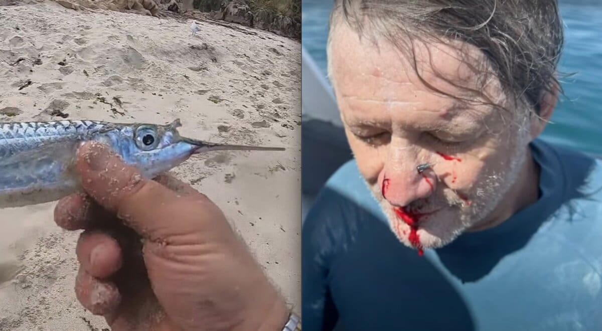 In a freak accident, a 30-centimeter garfish had jumped out of the water and struck him directly in the nose, just barely missing his eyes. The needle like nose of the garfish pierced his nose and came out the other side.