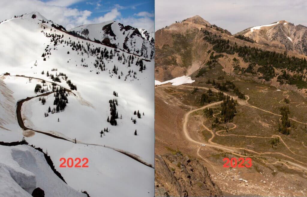 Look at what a difference a year makes! Images shared by Kicking Horse show the difference in snow packed from 2022 versus 2023. The Canadian ski area received just 615 cm (242 inches) of snow this past season. That is a dramatic shortfall in snowfall from a typical ski season for the Canadian Rockies ski area.