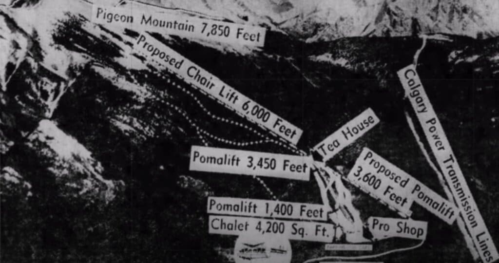 Arguably one of Alberta’s most famous abandoned ski areas is also its most unknown. The reasons why Pigeon Mountain is so mysterious is that no trail maps have emerged on the internet (minus a conceptual image above that was made before it opened), and the photos of it back when it operated are scant. Piegon Mountain had two life cycles: from 1962-69 and then 1977-1980. Once hyped as the next great Canadian ski resort, insufficient snowfall, warm winds, and a fatal lift incident chilled Piegon’s plans for glory.