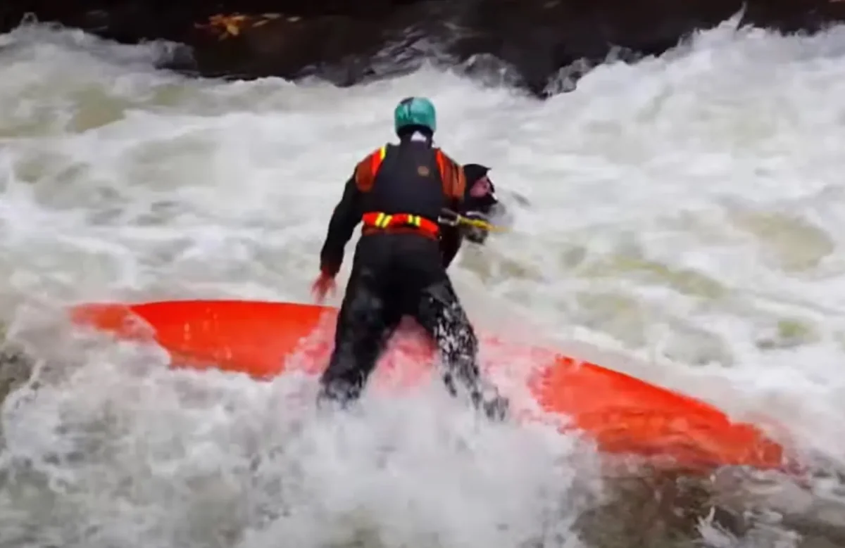 Hell of a save. Dig the parkour style monkey vault over the capsized boat. This video comes from a kayak competition in North Carolinaโฆhence the crowd cheering on the rescuer. Sweet reaction time and killer leap. Well played.