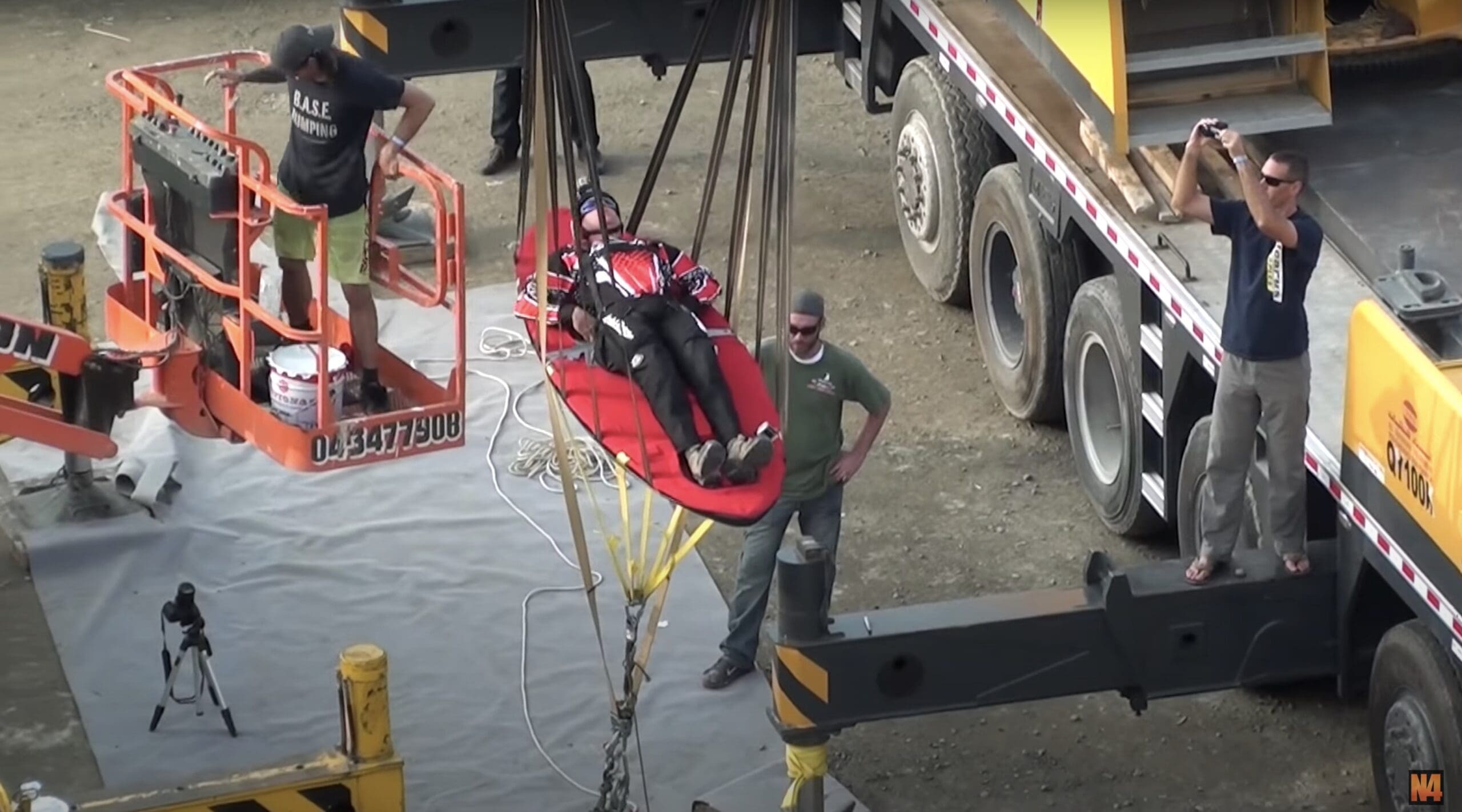 This is some Wiley Coyote stuff right here. Chris Douggs McDougall and Jimmy Pouchert traveled to Dubai for this incredible stunt. They were catapulted 300 feet in the air using a some industrial rubber bands strung between two construction cranes and went from 0-125mph in 1 second, experiencing over 6G’s. So Gnarly!