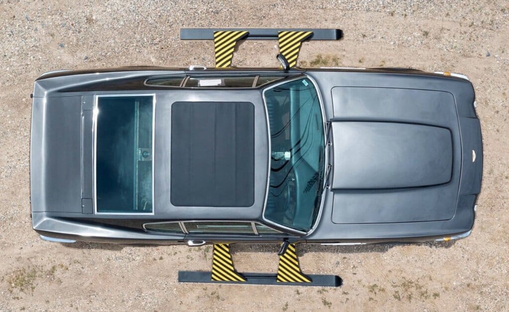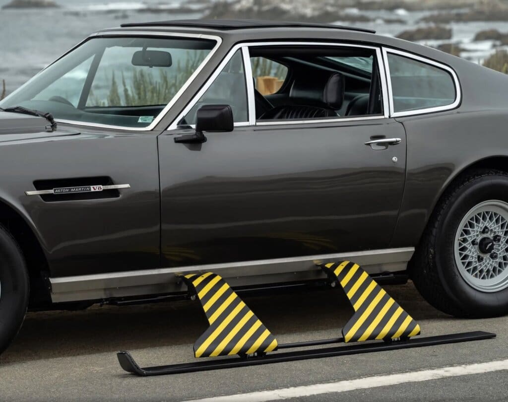 The car in the film was a brand-new, gadget-laden, Cumberland Grey V8 Saloon sunroof coupe…or so it appeared to filmgoers. In reality, it took a healthy dash of movie magic to put Bond behind the wheel. Due to an 18-month-long waiting list, Aston Martin could not supply EON Productions with new cars for filming, so the production team sourced a handful of Aston Martin V8s on the second-hand market and modified them for filming. Original configuration and condition did not matter, so long as they could be made to look like a new V8 Saloon on screen. Along with the cars used for filming, several prop replicas—little more than fiberglass body shells made by the studio—were also created (and destroyed) during production.