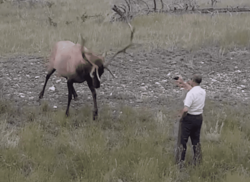 This video, which appears to have occurred during the rut season for elk, shows a brilliant tourist following none of those safety tips. Stay a safe distance? Nope, I’m going to get right up in the animals face with my phone. Back away cautiously when the animal begins to approach? Nope. I’m going to keep filming while backing away, just to increase those chances of tripping as much as possible. Run when the animal begins to initiate a charge? Of course not! That would ruin my footage!