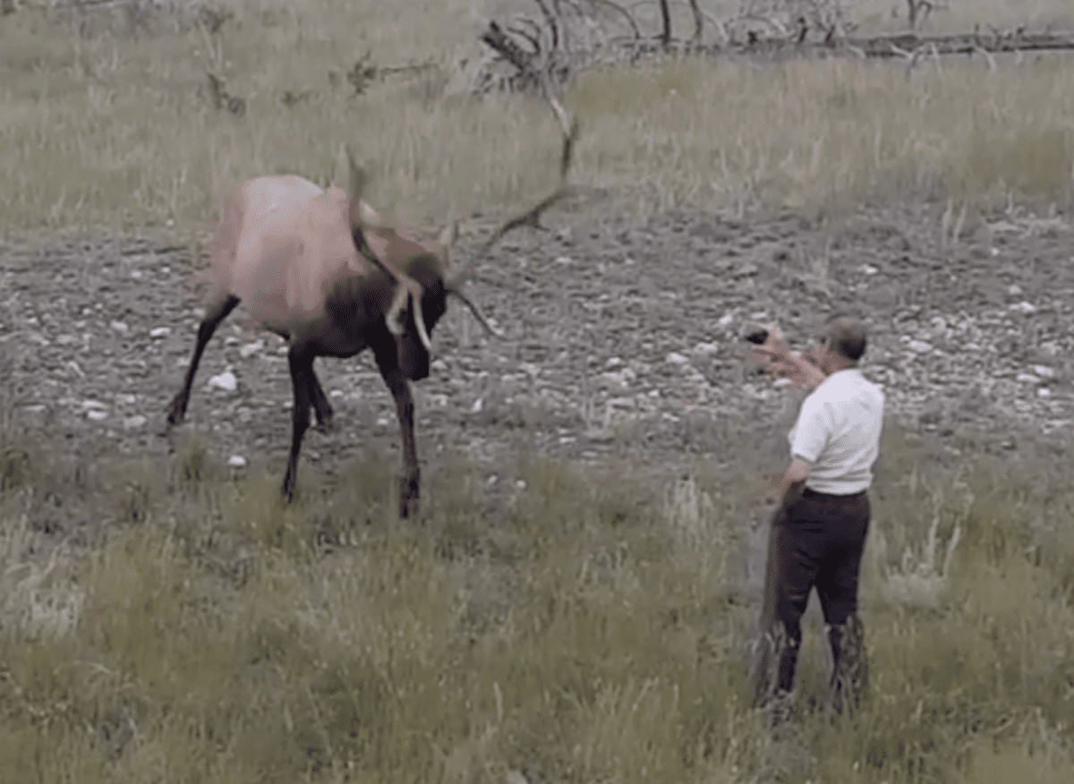 This video, which appears to have occurred during the rut season for elk, shows a brilliant tourist following none of those safety tips. Stay a safe distance? Nope, I’m going to get right up in the animals face with my phone. Back away cautiously when the animal begins to approach? Nope. I’m going to keep filming while backing away, just to increase those chances of tripping as much as possible. Run when the animal begins to initiate a charge? Of course not! That would ruin my footage!