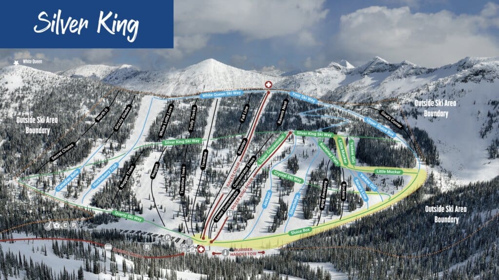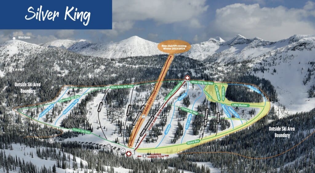 New Silver King Chairlfit: The Raven / Yutlxสท / Qukin chair is a fixed-grip quad chairlift from Leitner-Poma and can carry 1600 uphill guests per hour. The difference between its predecessor is that the new chairlift will travel 163 meters/ around 535 feet further up the mountain, concluding at the summit of Silver King Ridge. This means that they’re going to get a…[drumroll please]… terrain expansion! This new chairlift will allow Whitewater to add 123 acres of skiable terrain, most of which is of advanced difficulty. Fourteen steep and deep trails and glades have been added to Silver King, meaning there’s even more potential for face shots.