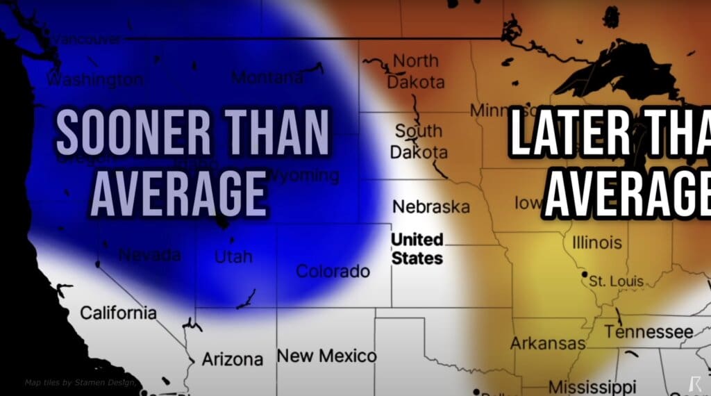 This week, YouTuber meteorologist Ryan Hall, Y’all broke down when areas of the country typically see their first snowfall. Ryan pointed out how El Nino will change this, with some seeing snowfall later than usual, while others seeing early snowfall. Regions predicted for snowfall later than usual include the Midwest and Northeast. Compared to the map pictured below, which shows the average dates, El Nino will move these first snow dates for some mountainous areas. With El Nino, we could see snowfall a week or two sooner in the west and later on in the Midwest and East.