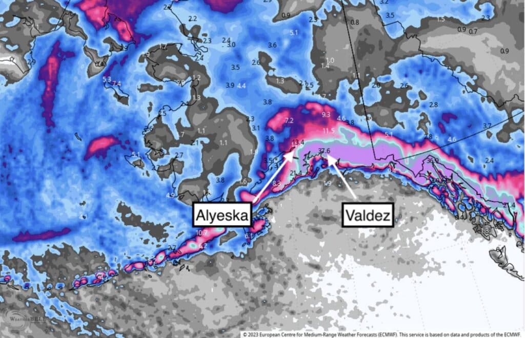 The mountains that Alaska Backcountry Guides operates near Valdez will also be hammered, with widespread 24+ inch totals preparing their snowpack for a deep season ahead!