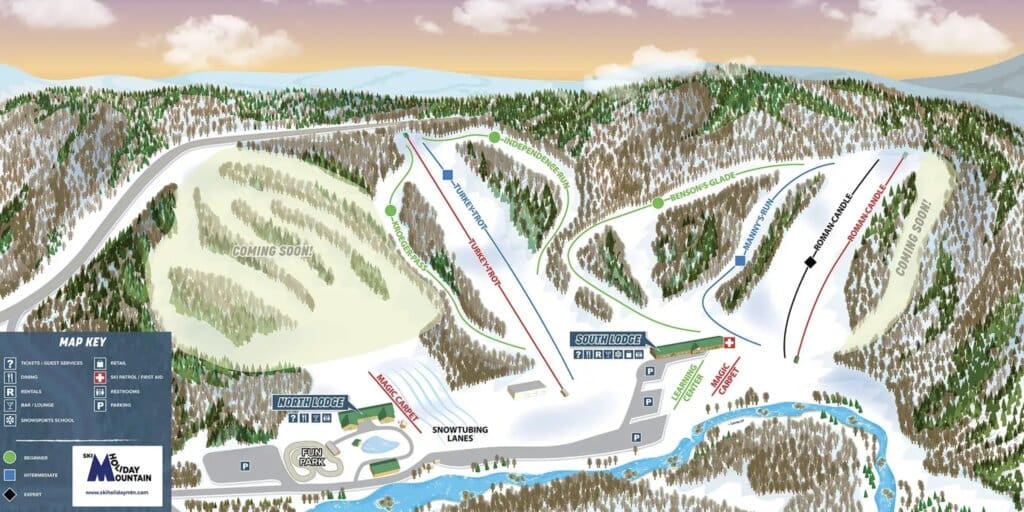 Since being sold this spring to Michael Taylor, Holiday Mountain in New York has been reinvigorated with various capital improvements. This has included a new trail map, which shows the reopened terrain (Turkey Trot), the terrain pod that will eventually see a new lift (to the left), and a new, very steep trail that will open during the 2024-25 season (far right).