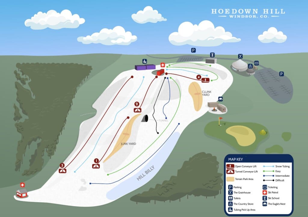 Colorado’s newest ski area is set to make its debut in the coming weeks. The upside-down ski area recently revealed its first official trail map, which nicely blends the trails and snow tubing area with the nearby surroundings.