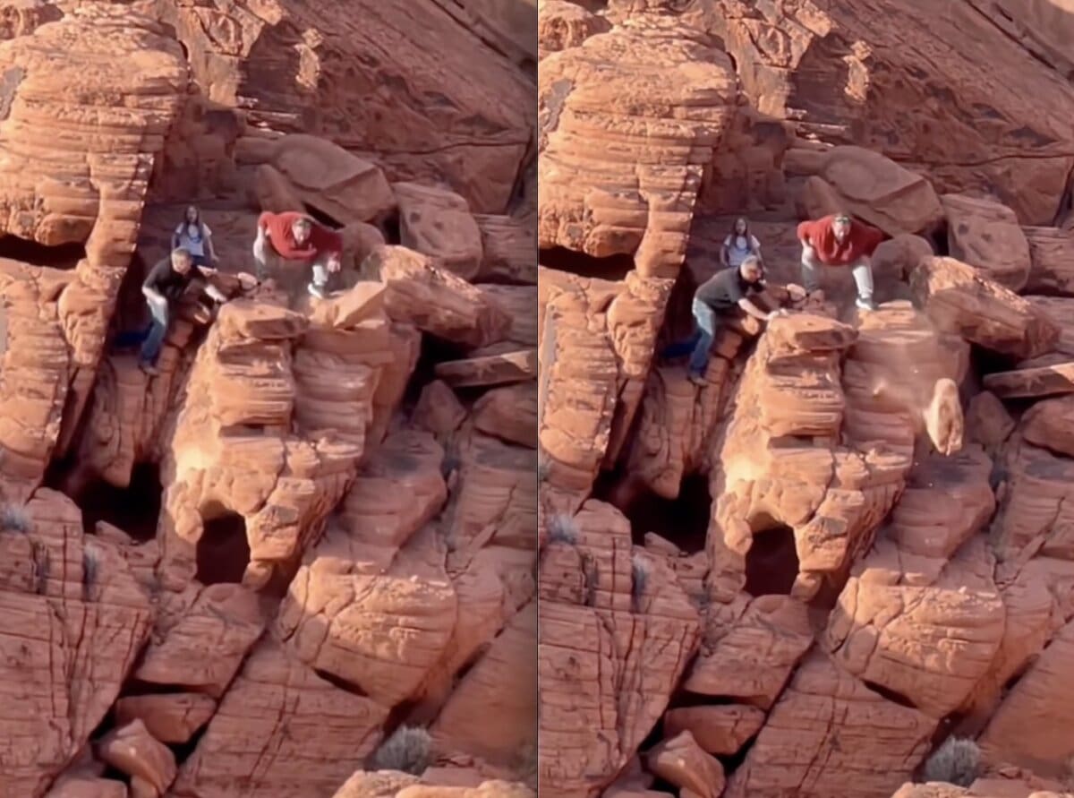 The following video was taken last Sunday at Lake Mead National Recreation Area, America’s first and largest national recreation area. Somewhere along the Redstone Dunes Trail, these two geniuses decided to dislodge ancient sandstone rock formations for their own personal entertainment. This video has been sent to the National Park Service and we hope the perpetrators are brought to justice.