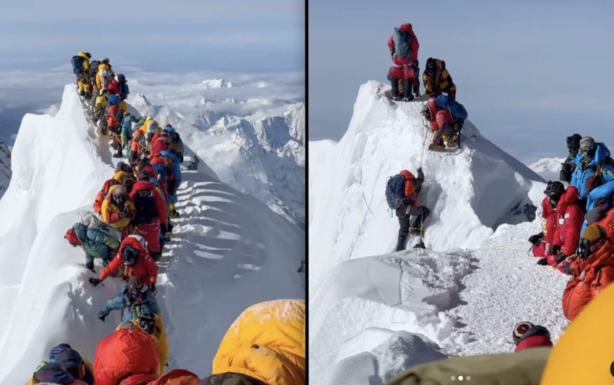 Mount Everest – IFMGA guide Vinayak Malla reached Everest’s summit at 6 am on May 21, the busiest summit day, with Elite Exped clients. On their descent, they recorded the aftermath of a snow cornice collapse, which dragged several climbers into the void. Though the video doesn’t show the collapse itself, it vividly depicts the overcrowded summit ridge, with dozens of climbers inching across a narrow snow arete that eventually crumbled.