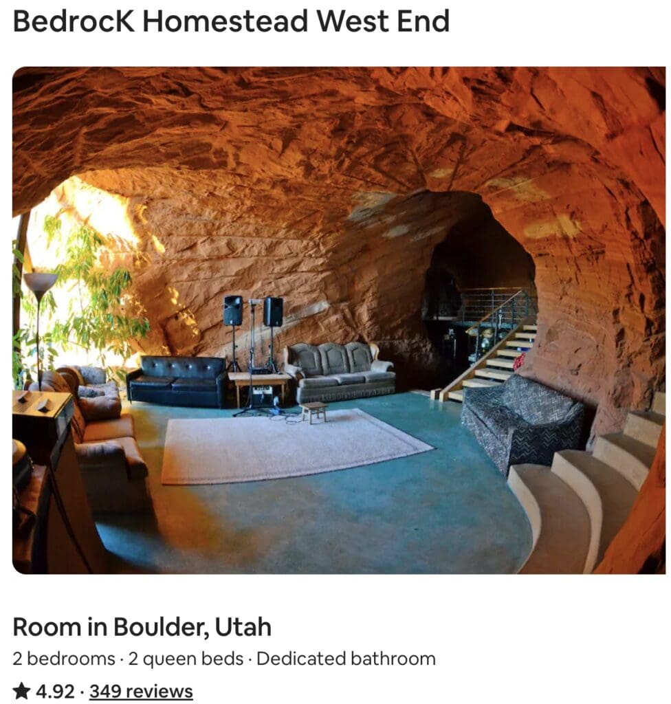AIRB&B LISTING FOR BEDROCK HOMESTEAD CAVE ($355 PER NIGHT: