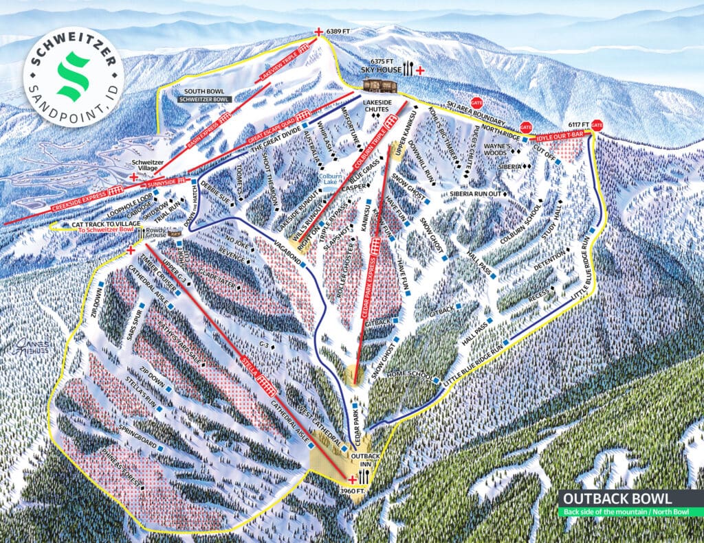 The new base area will eventually consist of a terrain expansion. Eight trails and four lifts are planned, with this area appealing to beginner and intermediate skiers. In addition, the New Lift 4 will connect to the Stella terrain pod/the Outback Bowl. This New Lift 4 will also have a mid-station unload for those who want to ski the expansion terrain. The Schweitzer Creek Village will have a rental shop, a SnowSports School, and a day lodge.