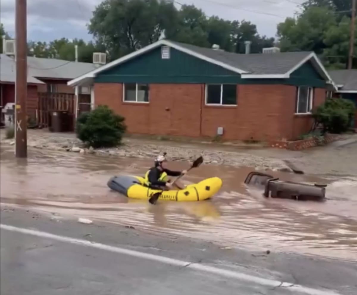 The video below, shared with Brian Schnee of KUTV News by Jimmy Peterson, shows a rafter taking on the Class 1 rapids on one of Moab’s flooded roads. The rafter took on the muddy waters, passing by a downed trash bucket. While he was rafting, one bystander humorously screamed :
