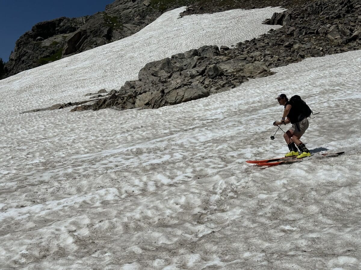 The hike to the top of the snowfield, according to my Strava, was about three quarters of a mile with different turns easily navigate the terrain and avoid walking on snow. If you want to just shoot straight up, it’s probably closer to half a mile. We chose to walk along a rocky trail next to the snow as much as possible, making it easier to hold traction. It’s really up to you, whatever’s easiest. The later in the summer you head up there, the less snow there will be. You won’t have to hike as far if you wait until late August, but you also won’t be able to ski as far.