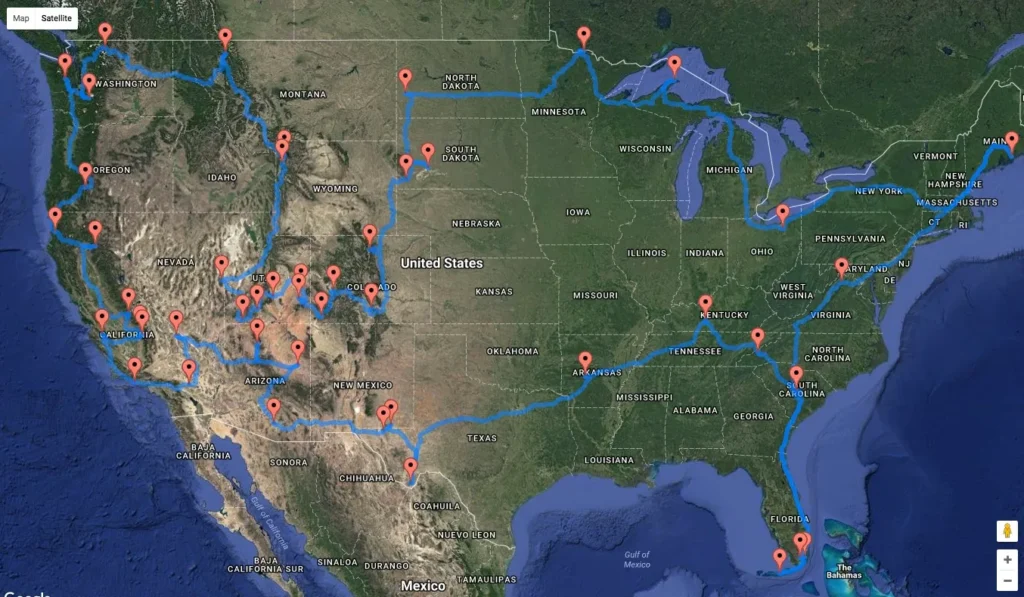 50 major U.S. landmarks were chosen as inputs (one in each state excluding Alaska/Hawaii and including D.C. and two in California) and what came out on the other end is a truly epic roundtrip itinerary spanning 13,699 miles and 224 hours (9.33 days) of driving in total with the assumption of no traffic. Dr. Olson recommends budgeting 2-3 months to comfortably complete this ultimate roadtrip.