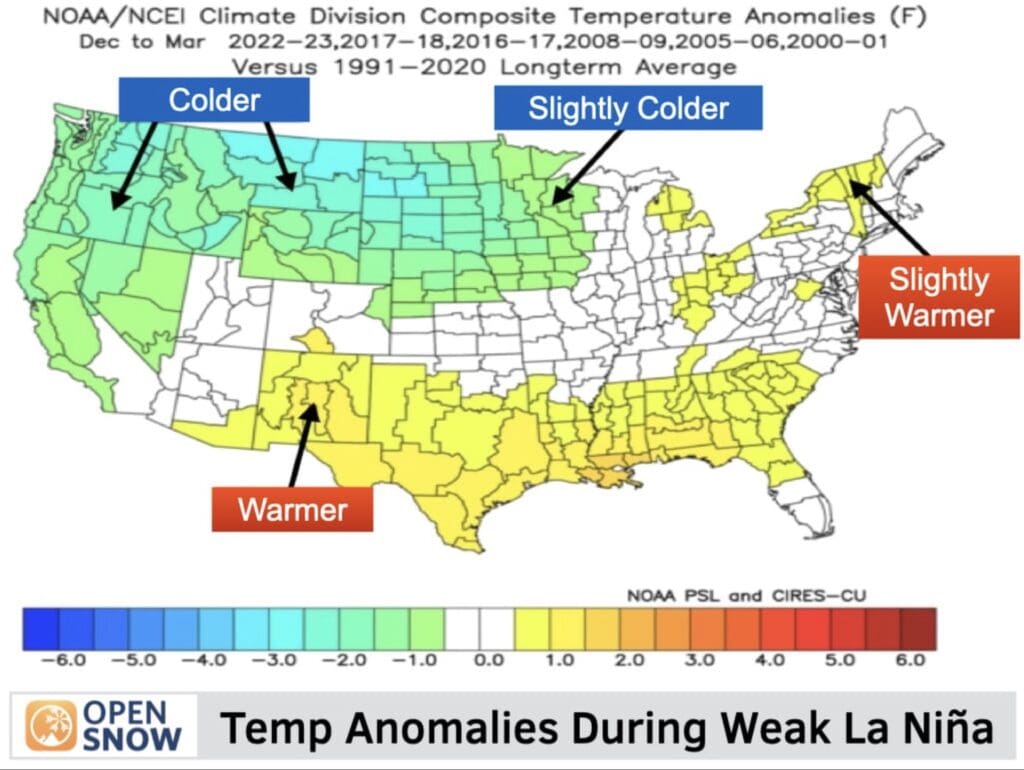 Due to the weak La Niña, OpenSnow predicts snowier conditions for the Adirondacks, Midwest, the northern Rockies, Utah, and California. Drier conditions are predicted for the Southwest, Pacific Northwest, and Southeast. In terms of New England, I imagine it’ll rain around Christmas time.